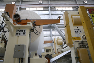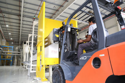 The reels arriving from the re-winder are wrapped with a plastic film and labelled, then carried to the warehouse where they are stored until they are shipped to customers.